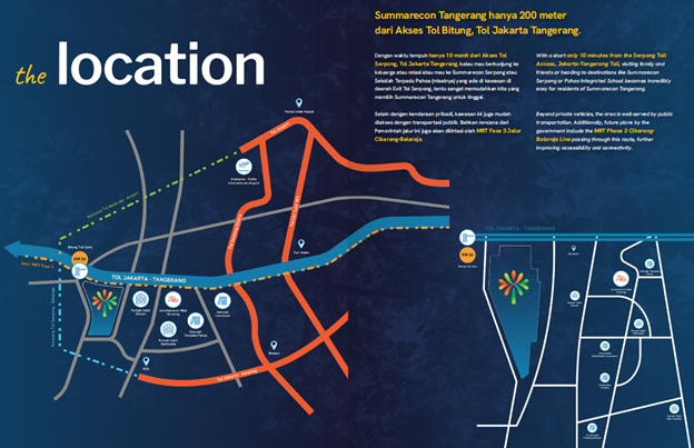Kawasan Kota Mandiri Summarecon Tangerang berlokasi strategis, hanya berjarak 5 menit dari Pintu Tol Bitung dan 30 menit ke Bandara Internasional Soekarno-Hatta.