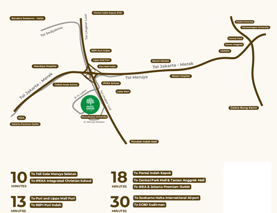 Pacific Garden Puri berlokasi strategis, hanya 10 Menit ke Tol Gate Meruya Selatan, Sekolah IPEKA serta 13 Menit ke Lippo Mall Puri.